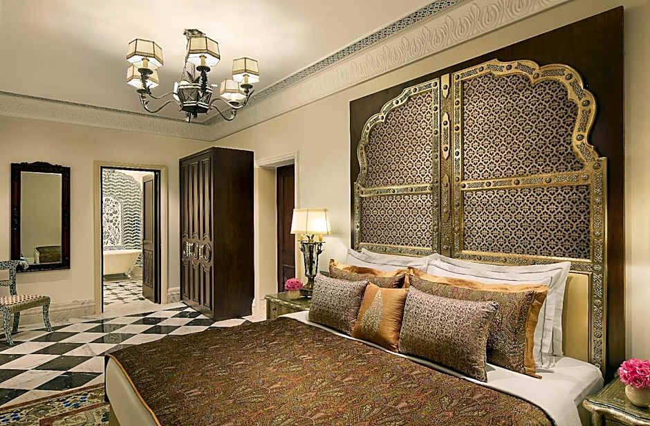 Opening out to scenic garden views, spacious Indian-style suite features a 4-poster bed and study and lounge areas.