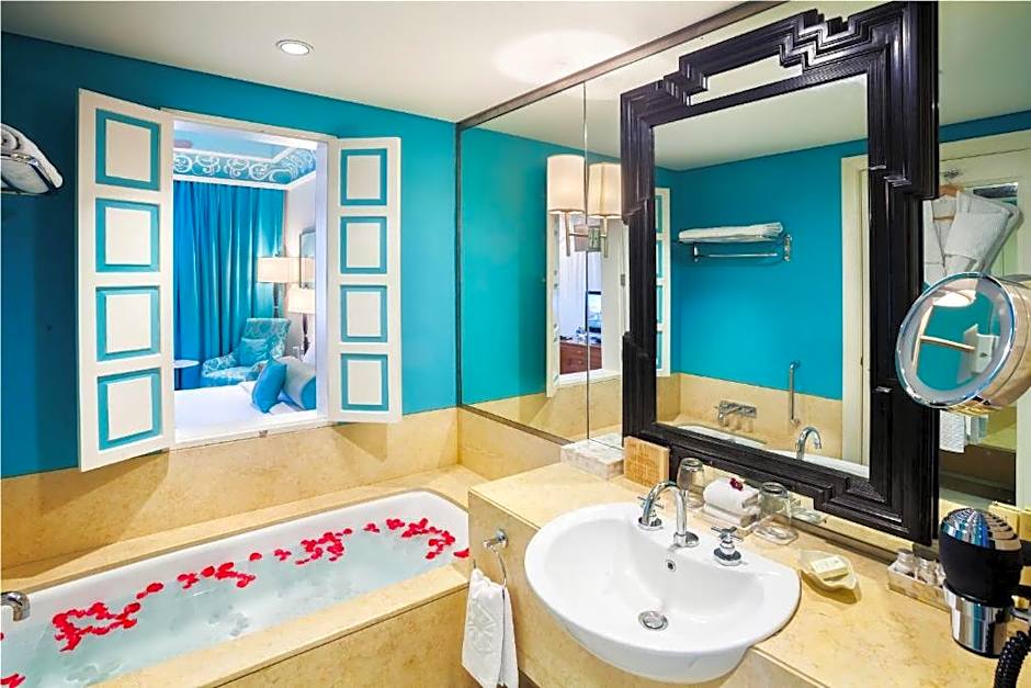 Features rich shades of turquoise and red, spacious bathroom comes with a bathtub and separate shower cubicle.